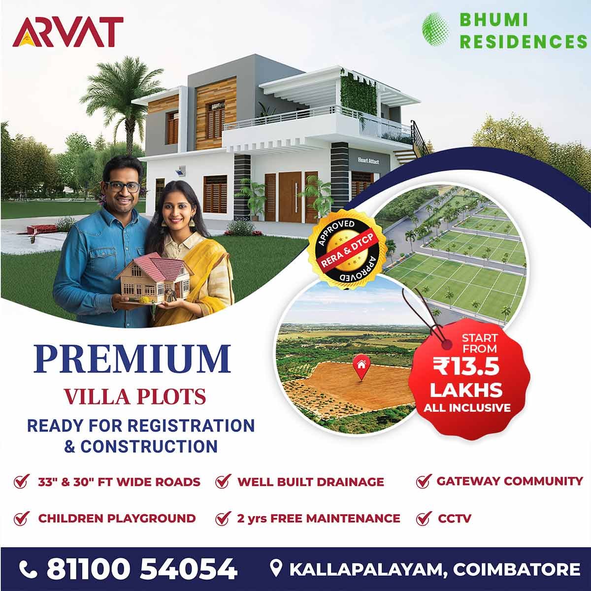 Welcome to Arvat Bhumi Residences, an exclusive plotted development nestled in the serene surroundings of Kallapalayam, Coimbatore.Designed with a vision of growth, security and belonging, Bhumi Residences offers the perfect foundation to build your dream home and a smart investment that grows with you.